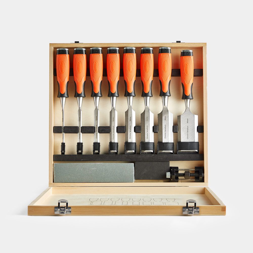 The set includes 8 chisels in the following sizes: 6mm, 10mm, 13mm, 19mm, 25mm, 32mm, 38mm, and 50mm, providing a wide range of options for detailed woodworking and larger shaping tasks.