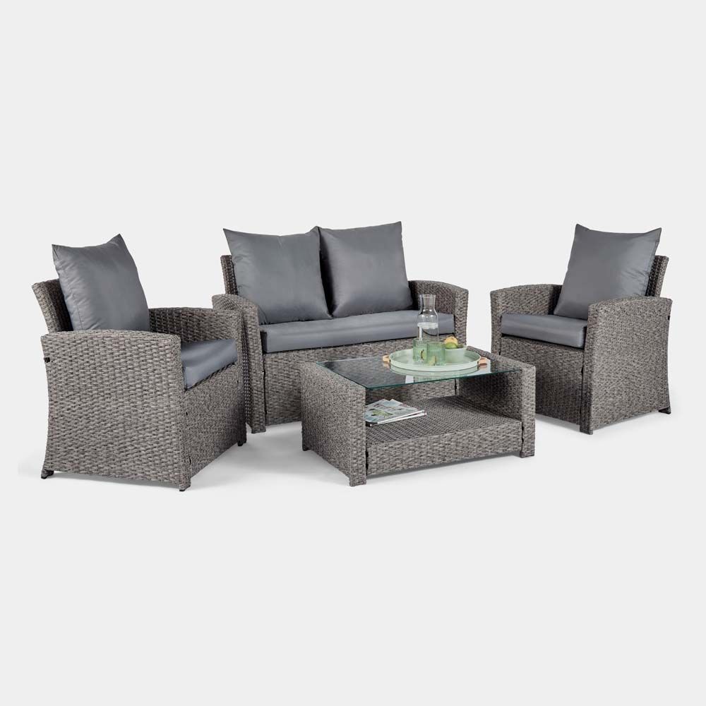 Comprising of two deep cushioned high-backed armchairs, a deep cushioned sofa and a rectangular glass topped table with shelf. The 80cm long table offers dual storage – a convenient lower shelf and glass top surface.