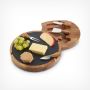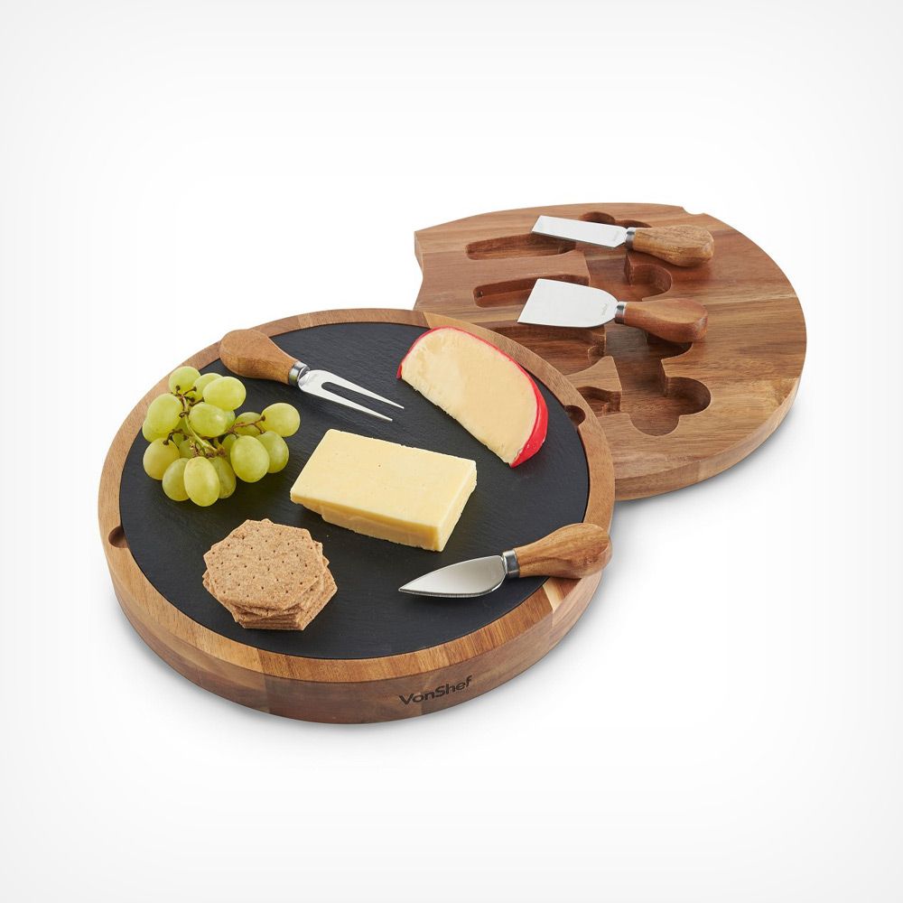 Add contemporary style to your snacking Made from tough acacia wood, our sleek, round cheese board set will fit right at home in your kitchen or dining room space, thanks to its subtle, circular design.